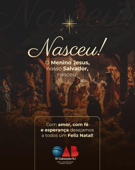 Neste Natal, a 15ª Subseção OABRJ deseja que cada advogado e advogada encontre inspiração no significado profundo do nascimento de Cristo: a promessa de justiça, de paz e de fraternidade. Assim como a advocacia se ergue em defesa da dignidade humana, também este nascimento nos lembra que a esperança é o alicerce para dias melhores.